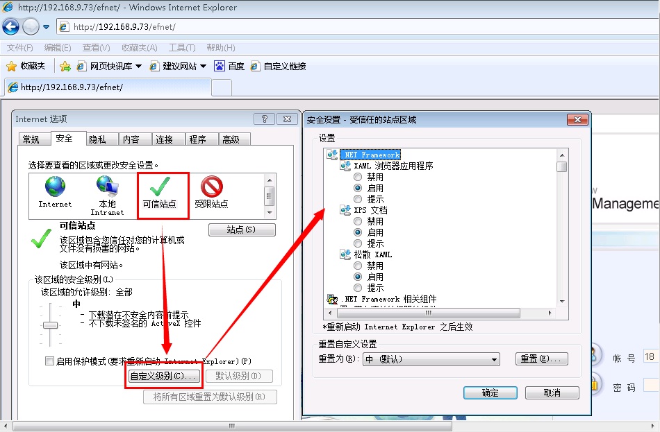 1.请将EF.NET 主机网址的位址 加入信任网站