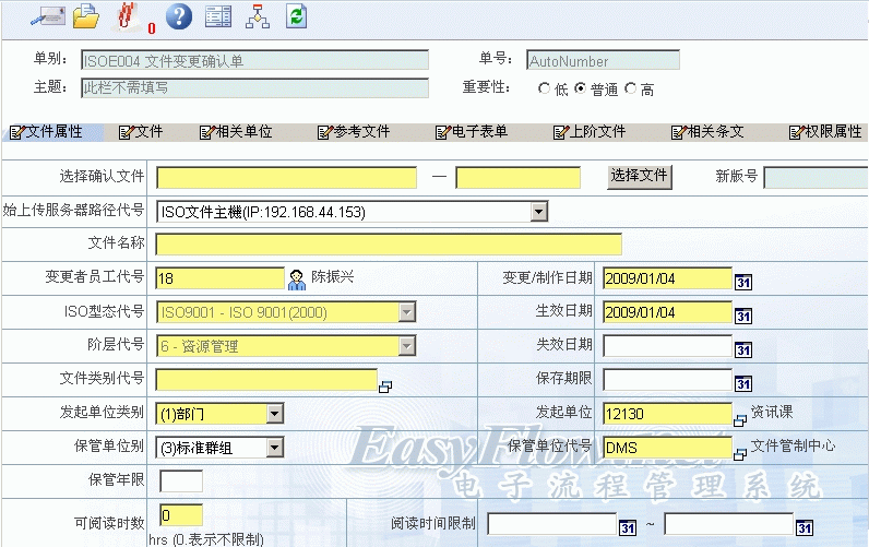 当您欲变更确认一份ISO文件供大家浏览取用,且需要对此文件做版本控管时,填写本表单,经审核单位审核,文管中心赋予文件新版号後,系统会将此文件上载至原始文件主机上,再经文管人员发布後,其他人就可以浏览此文件了。 |