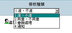 签核种类选项主要用以设定签核者可以选择的签核方式是那一种,例如您在这个选项中选择 1 = 准、不准,则负责签核者就只有签准与不准两种选择,而不能够有同意、不同意..等其它的批示。