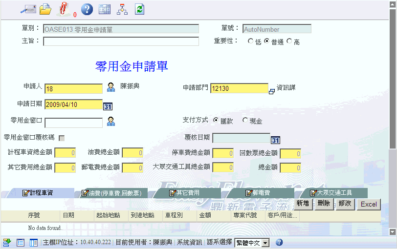 当您需要申请零用金,可以开启EasyFlow使用本表单填写零用金申请单的相关资讯,如:计程车资、油费、其他费用、邮电费、大众交通工具等。