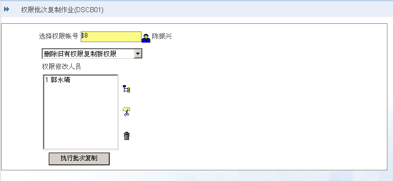 依据本功能清单,可批次新增指定程式权限、删除所有使用者对於指定程式的权限,以及显示所有使用者对於指定程式的权限。 |