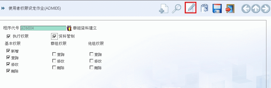 1. 新增指定程式的权限给所有的使用者,画面如下,请由下拉选单中选定程式代号,再依序选择给定的各项权限,如:读取、新增、修改、删除、列印、报表、拥有等。