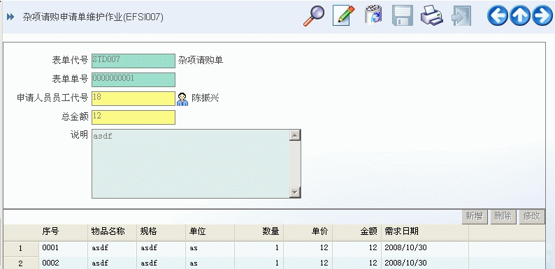 提供一个电子表单资料档的维护介面,允许足够权限的使用者查询请购单的资料;或是在必要的状况之下(比如後端作业发生错误,导致资料库内的资料内容与实际状况不符),直接编修表单资料。