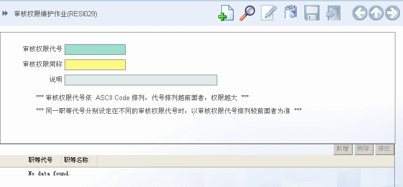 建立并维护核决权限的代号,以便稍後在核决权限规则定义作业中,建立流程核决权限表。