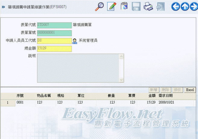 提供一個電子表單資料檔的維護介面,允許足夠權限的使用者查詢請購單的資料;或是在必要的狀況之下(比如後端作業發生錯誤,導致資料庫內的資料內容與實際狀況不符),直接編修表單資料。