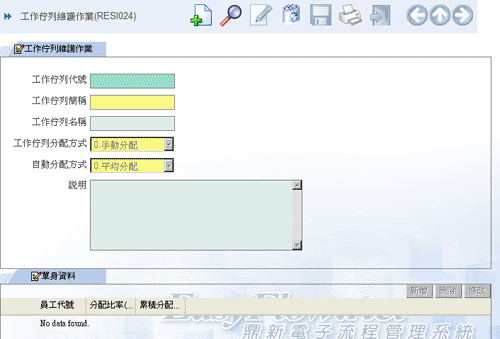 1. 工作佇列為表單流程角色之一;將數個員工設定屬於同一工作佇列,則表單在此流程關卡時,會依"自動分配方式"、"分配計算週期"及"分配比率"等資訊分配給同一佇列員工處理。例如:我們建立一工作佇列名為"Queue1",並設定為"比率分配",分配之週期為"日",接著將隸屬這個Queue1的員工加進來,並設定其分配比率,當工作佇列有未處理表單時,即會依此比率分配給佇列員工處理。